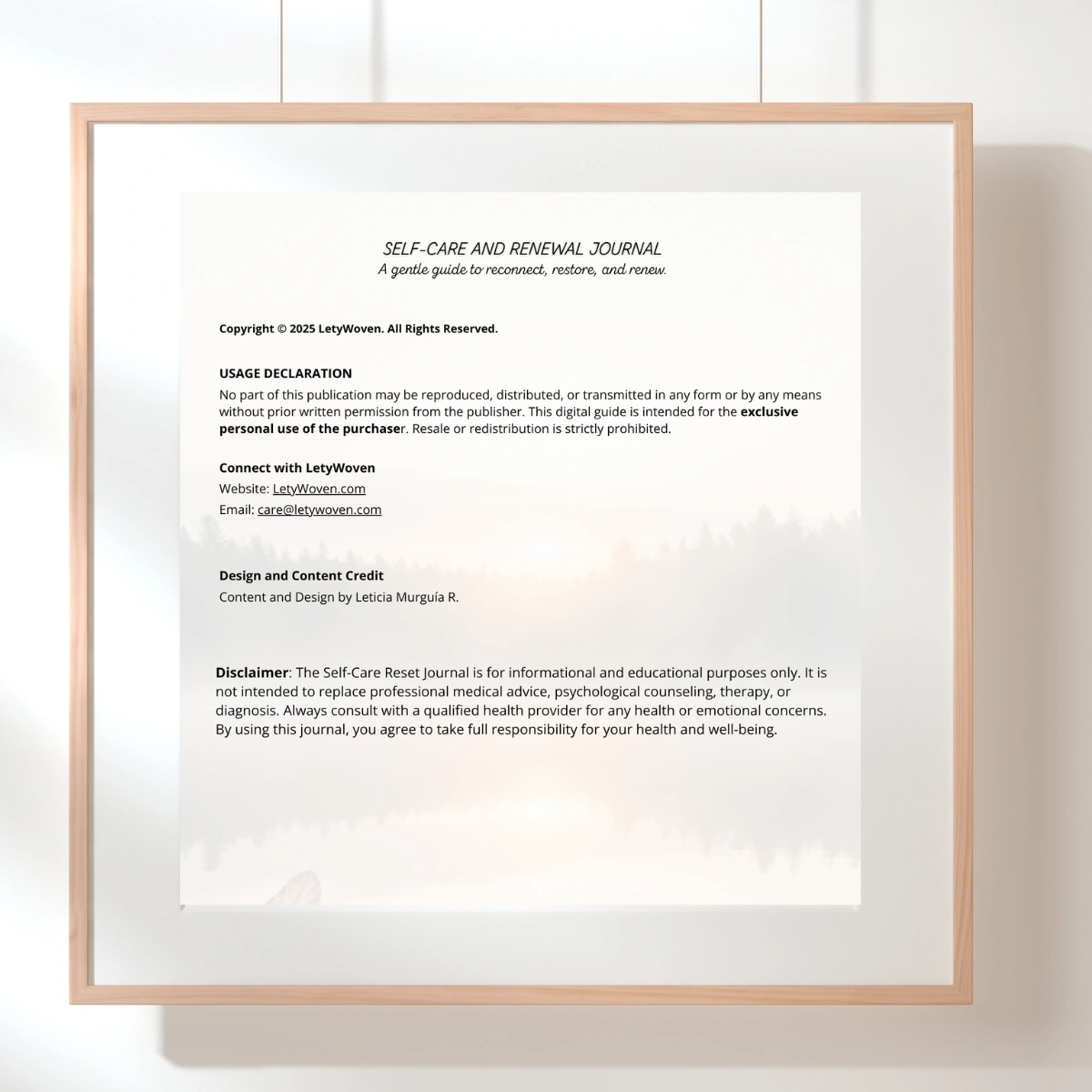 Disclaimer: The Self-Care Reset Journal is for informational and educational purposes only. It is not intended to replace professional medical advice, psychological counselling, therapy, or diagnosis. Always consult with a qualified health provider for any health or emotional concerns. By using this journal, you agree to take full responsibility for your health and well-being.